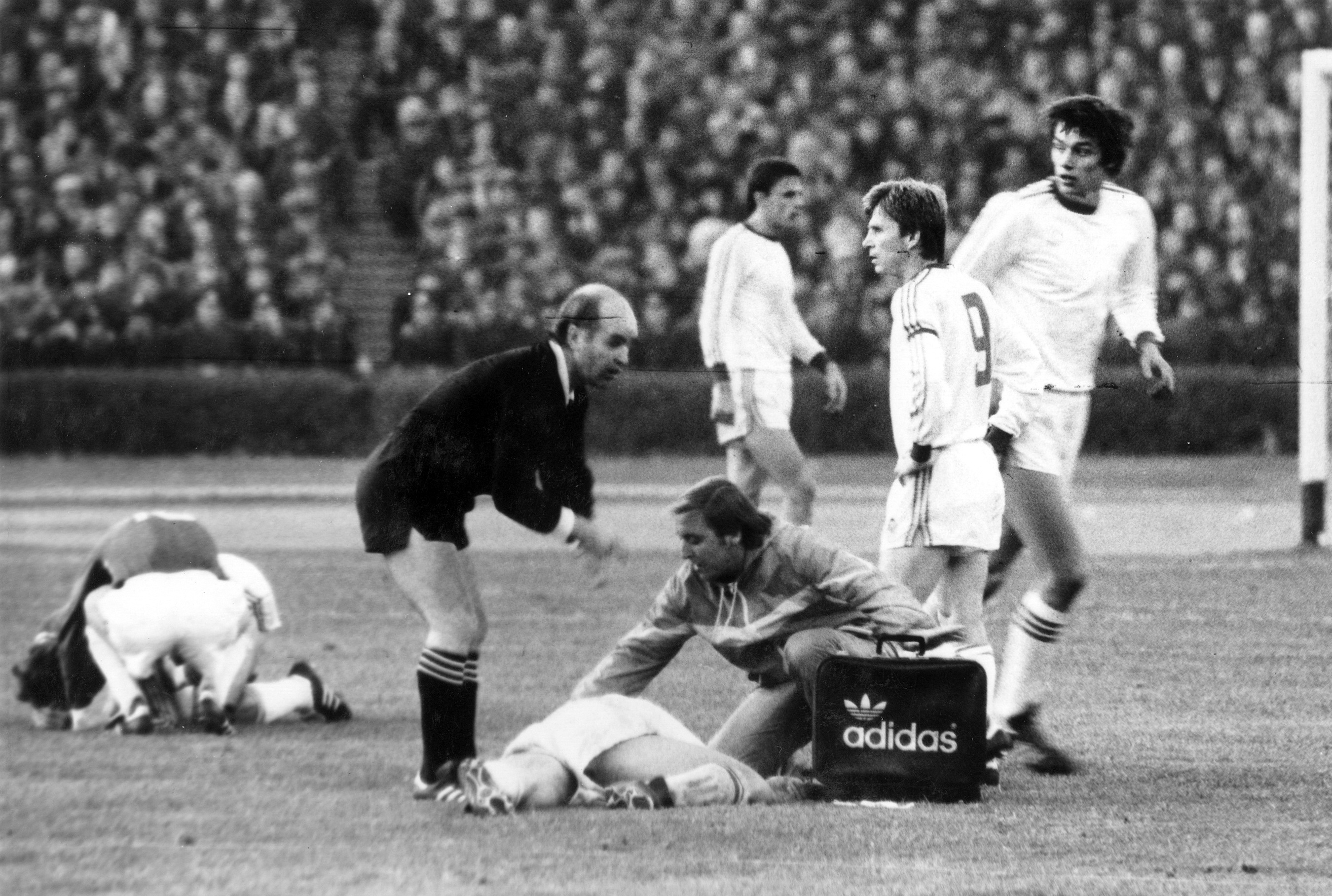 Врач Николай Черныш (справа) помогает выйти с поля Геннадию Литовченко. На дальнем плане Сергей Базулев (№ 4)